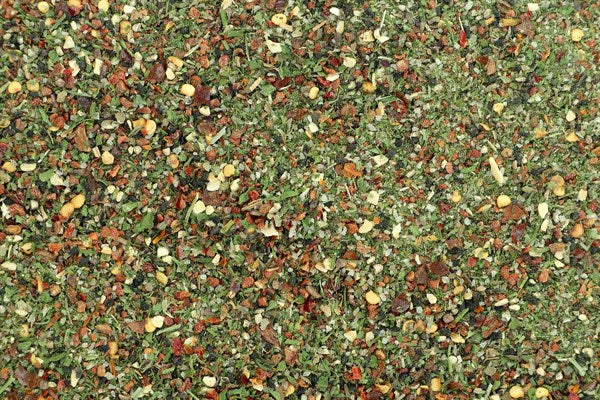 Una mezcla de hierbas y flores de sal para una ensalada de tomates y queso mozzarella italiano.